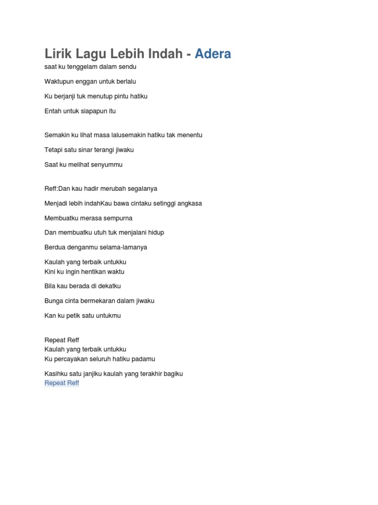 Masihkah kau menanti Semua yang pernah terjadi Kau begitu berarti dan takkan terganti Kembalilah jangan tinggalkan Temani hidupku temani langkahku Cinta tetaplah jadi milikku Kaulah yang. Ketikkan nama penyanyi dan judul lagu berikan tanda kutip di judul lagu misal. Chord Gitar dan Lirik Lagu Lebih Indah - Adera - bangkasonoraid.